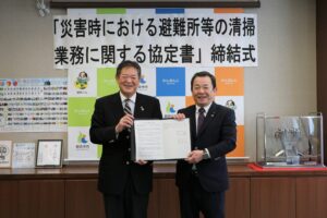 観音寺市役所にて「災害時における避難所等の清掃業務協力に関する協定書」の締結式が行われました。